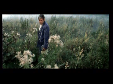 2) средним планом — за камышами или травой — водная поверхность, по которой движется листок; камера сдвигается в гущу травы и переходит на человека, который, однако, стоит спиной к тому, что было только что показано камерой; персонаж проводит взглядом вокруг себя, а затем смотрит вниз;