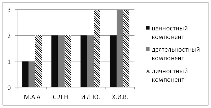 Ценностный компонент представлен профессиональной активностью педагога, которая подтверждает индивидуальную значимость педагогической деятельности. Показателем профессиональной активности выступает уровень квалификации (высшая категория, первая категория, соответствие занимаемой должности), а также инициативность в профессиональном развитии и совершенствовании (научно-исследовательская деятельность, курсы повышения квалификации, конкурсы педагогического мастерства и т. п.).